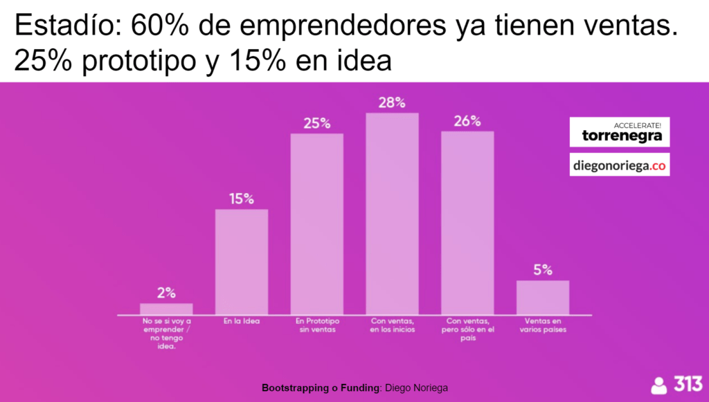 ¿EN QUÉ ESTADIO ESTÁ TU EMPRENDIMIENTO? La mayoría está entre prototipos y ventas iniciales, entonces de nuevo, la importancia de que cuando ya tengas ventas y sobre todo cuando estás exportando tu producto tiene muchas oportunidades de conseguir financiación de tus clientes y obviamente de inversiones.