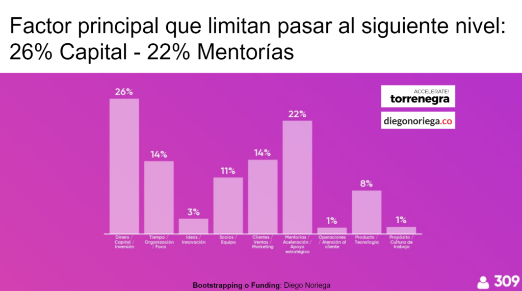 Aquí está muy claro que hay una necesidad o deseo que está 10x lejos de la realidad. Como vimos en el anterior slide, solo el 5% de los emprendedores lograron inversión de Angels y VCs. En cambio casi el 30% les gustaría estar tener inversión ángel (hoy 4%) y lun 16% ser invertidos por VCs (hoy 1%)