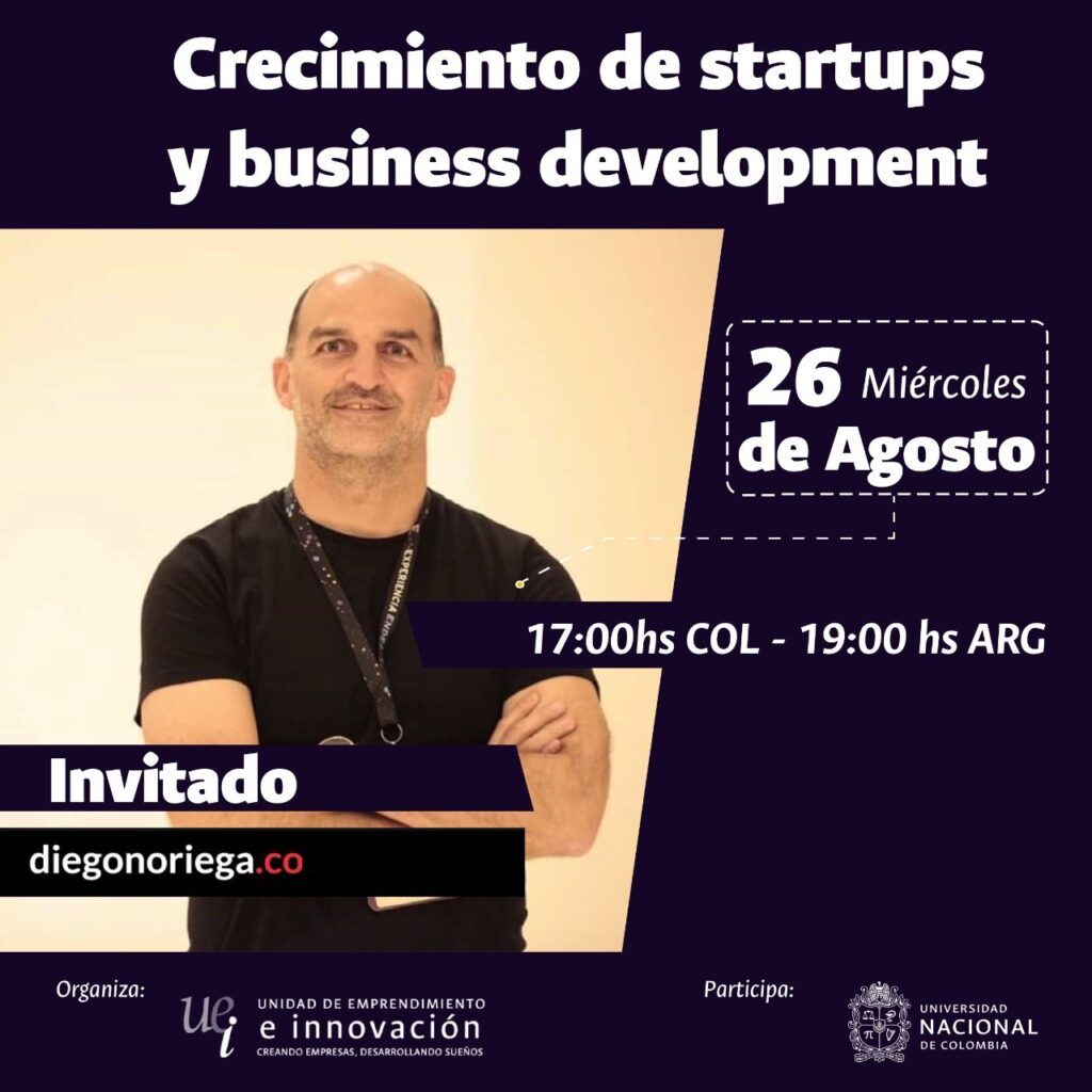 Este miércoles 26 de agosto a las 17:00hs COL-19:00hs ARG, estare en vivo desde mi canal de Youtube, junto a UEL & Universidad Nacional de Colombia, disertando sobre crecimiento de startups y business development.