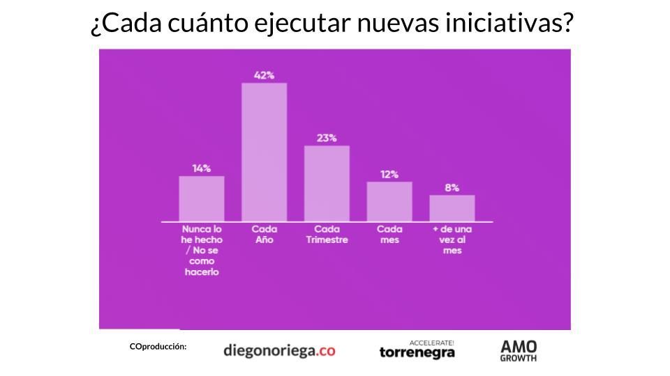 Aunque la gran mayoría de personas ejecuta ideas cada cierto tiempo determinado, solamente el 8% las ejecuta más de una vez al mes. En mi opinión, todos los días tenemos que ejecutar nuevas ideas, experimentar y nutrirnos de información del mercado para ajustar los canales y productos que ofrecemos al mercado, eso con ayuda de KPI´s que no brinden indicadores de medición.