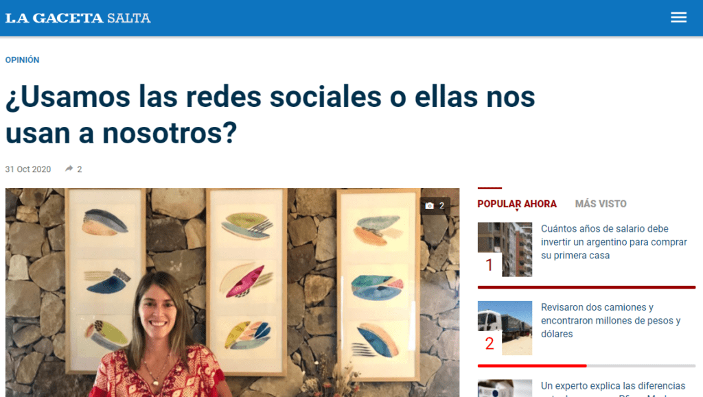 Hace poco estaba leyendo uno de los medios informativos más importantes de Salta, La Gaceta. Allí me encontré con un artículo de opinión de mi gran amiga y emprendedora Vicky Villamayor en donde hablaba sobre el uso de las redes sociales con base en el documental «The Social Dilemma» en Netflix. Con ella hablamos hace un tiempo sobre emprendimientos, mentorías y redes sociales, por lo que se relaciona mucho con su artículo publicado